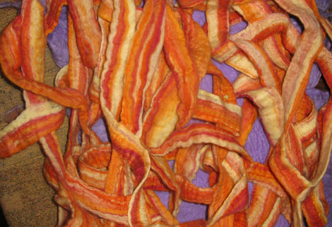 Zainteresowałam się filcowaniem, bo to ciekawa technika. Najpierw filcowałam ręcznie z mydłem, później kupiłam taką maszynę do tzw. suchej igły, która filcuje igłą bez użycia wody. Kilka obrazów udało mi się sprzedać na prezent. To jest technika kosztowna, bo sama wełna sporo kosztuje i pracochłonna, to się ludziom podoba, mówią, że ładne, ale zrozumiałe, że musi trochę kosztować. Kilka razy byłam z obrazami w Arche na targach przedświątecznych. Sam kwiatek do obrazka robi się 3 godziny, potem jeszcze trzeba połączyć w całość z tłem. Kwiatki mogą też występować jako samodzielne ozdoby do swetra np. Lubię sobie poeksperymentować i robiłam też fantazyjne szaliki i próbowałam łączyć koronkę szydełkową, którą robiła moja mama z tkaniną – jako aplikacje do płaszcza, czy spódnicy. I to też wygląda ciekawie. Jak będę na emeryturze, to może sobie zadziergam i może wtedy nie będę już chciała zarobić, tylko będę robiła dlatego, że lubię, podoba mi się to. Ale jeszcze mam dużo czasu przed sobą.